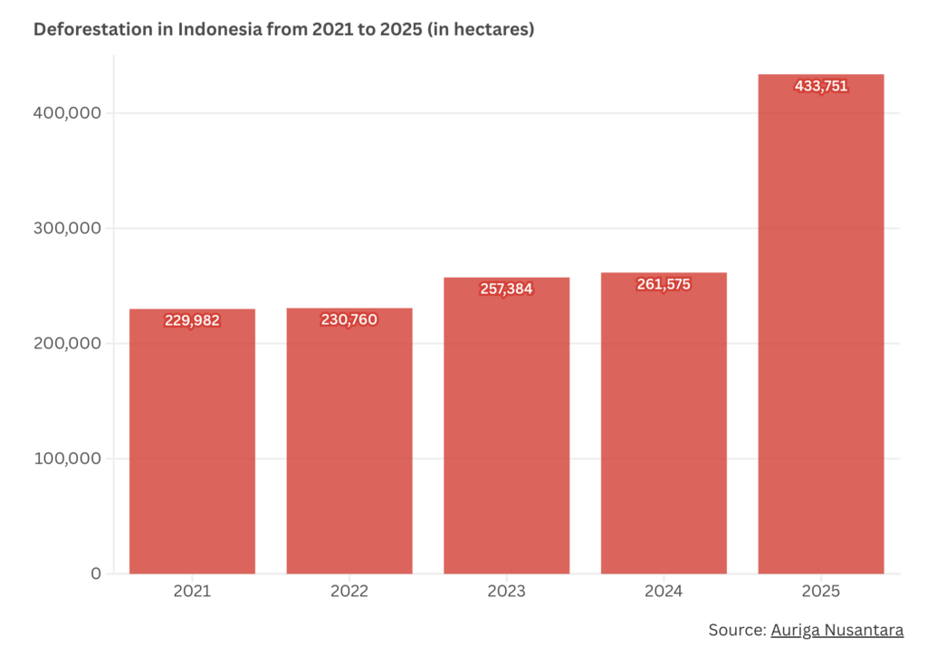 Auriga Nusantara, an Indonesian NGO, estimates that more than 430,000 hectares were cleared last year, a jump of 66% from 2024. The increase follows a period when forest loss had fallen steadily, reaching a low in 2021 after a series of policy interventions and tighter oversight. Since then, losses have climbed each year, with 2025 marking a clear break from the earlier trend.